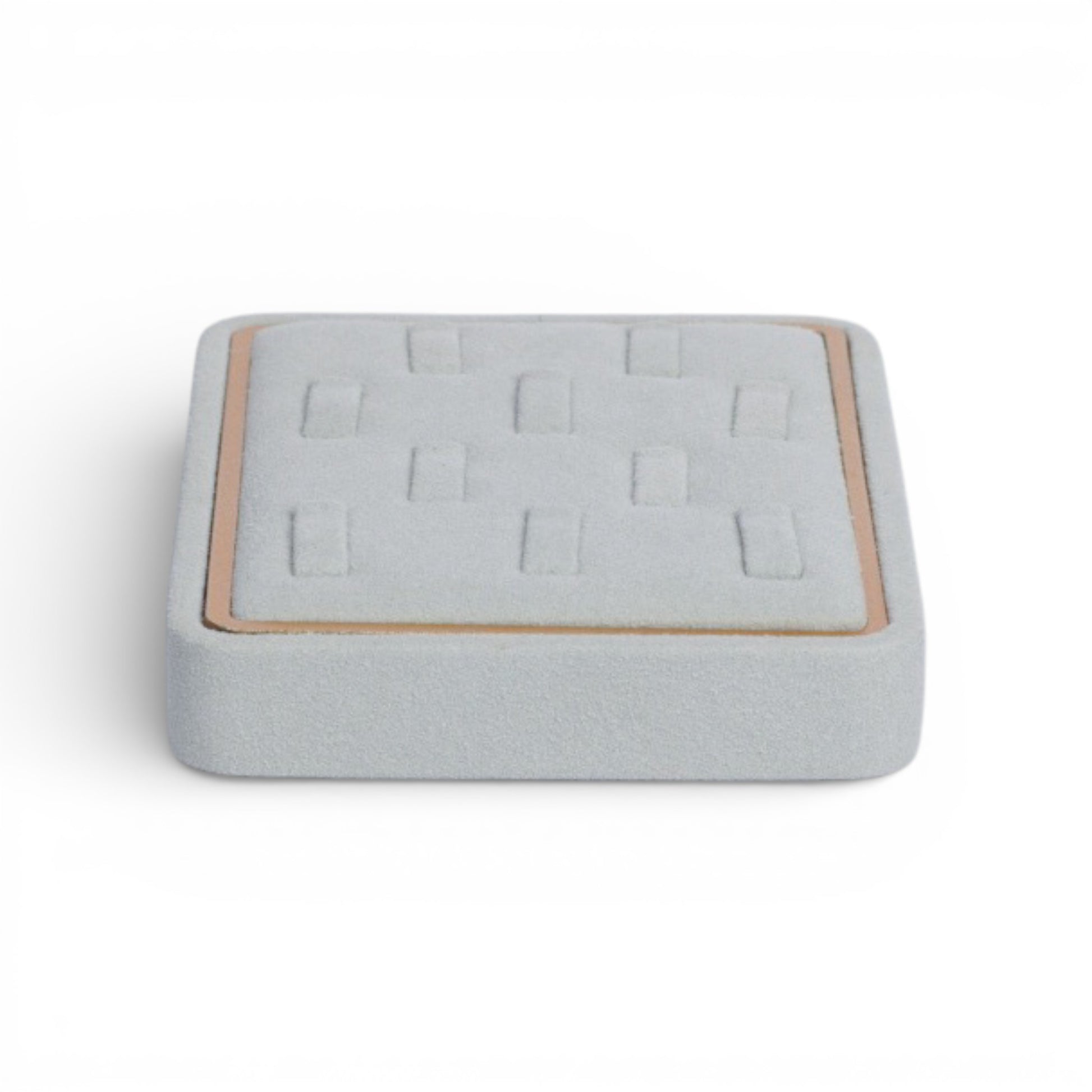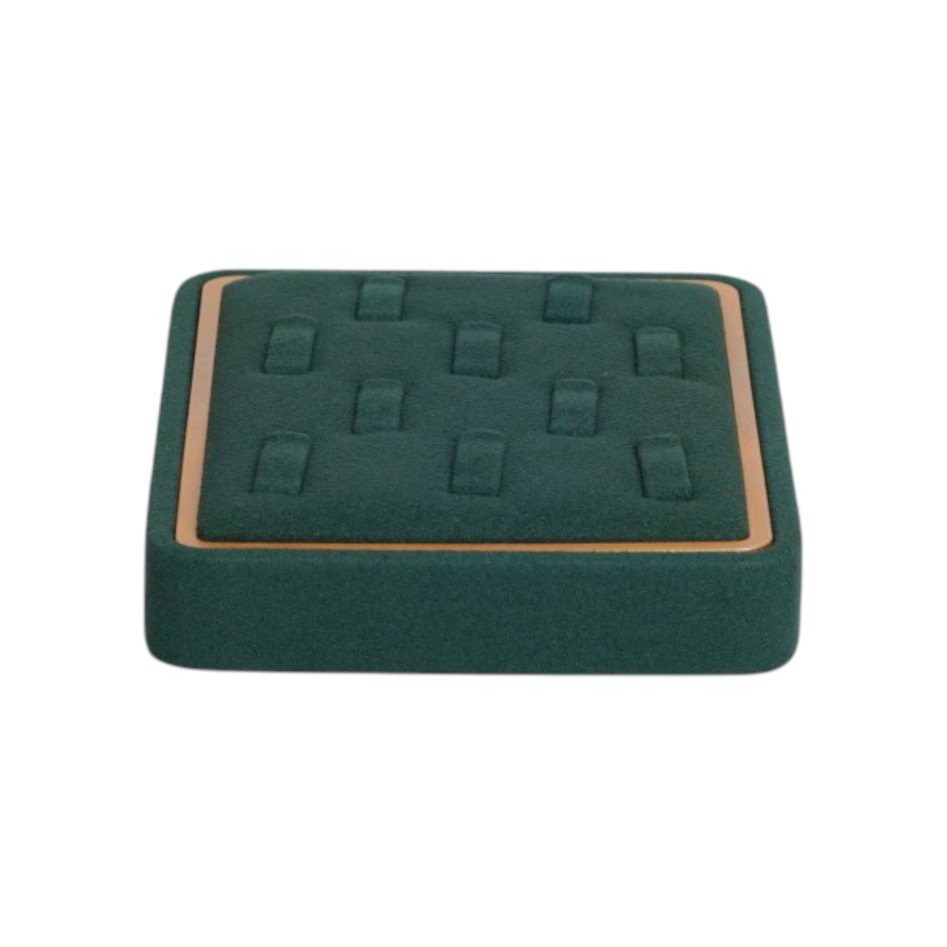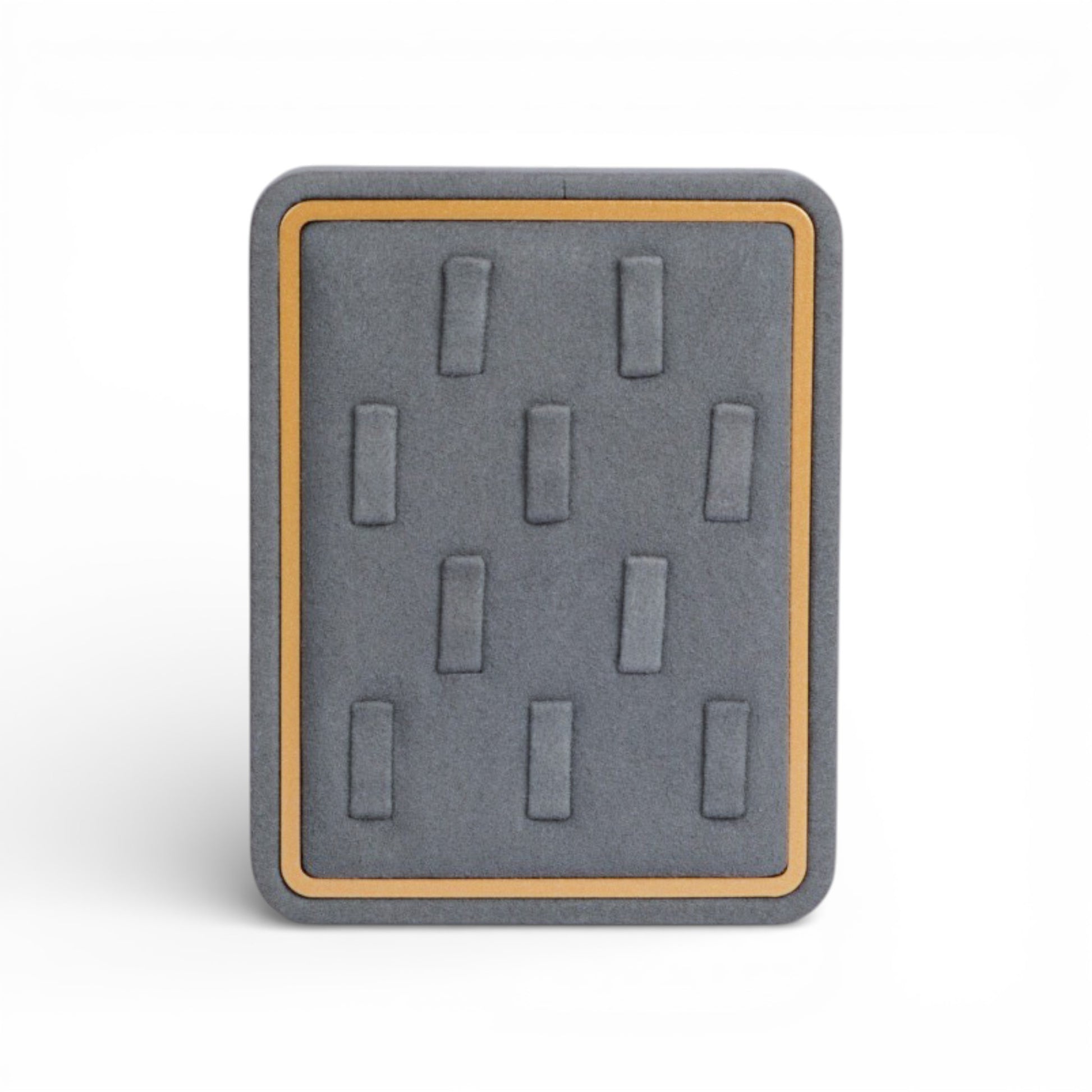 Designed for refined jewelry presentation, this ring display tray combines a soft fabric surface with a clean gold-accented frame. Its structured layout allows multiple rings to be displayed securely while maintaining a balanced and elegant visual rhythm.