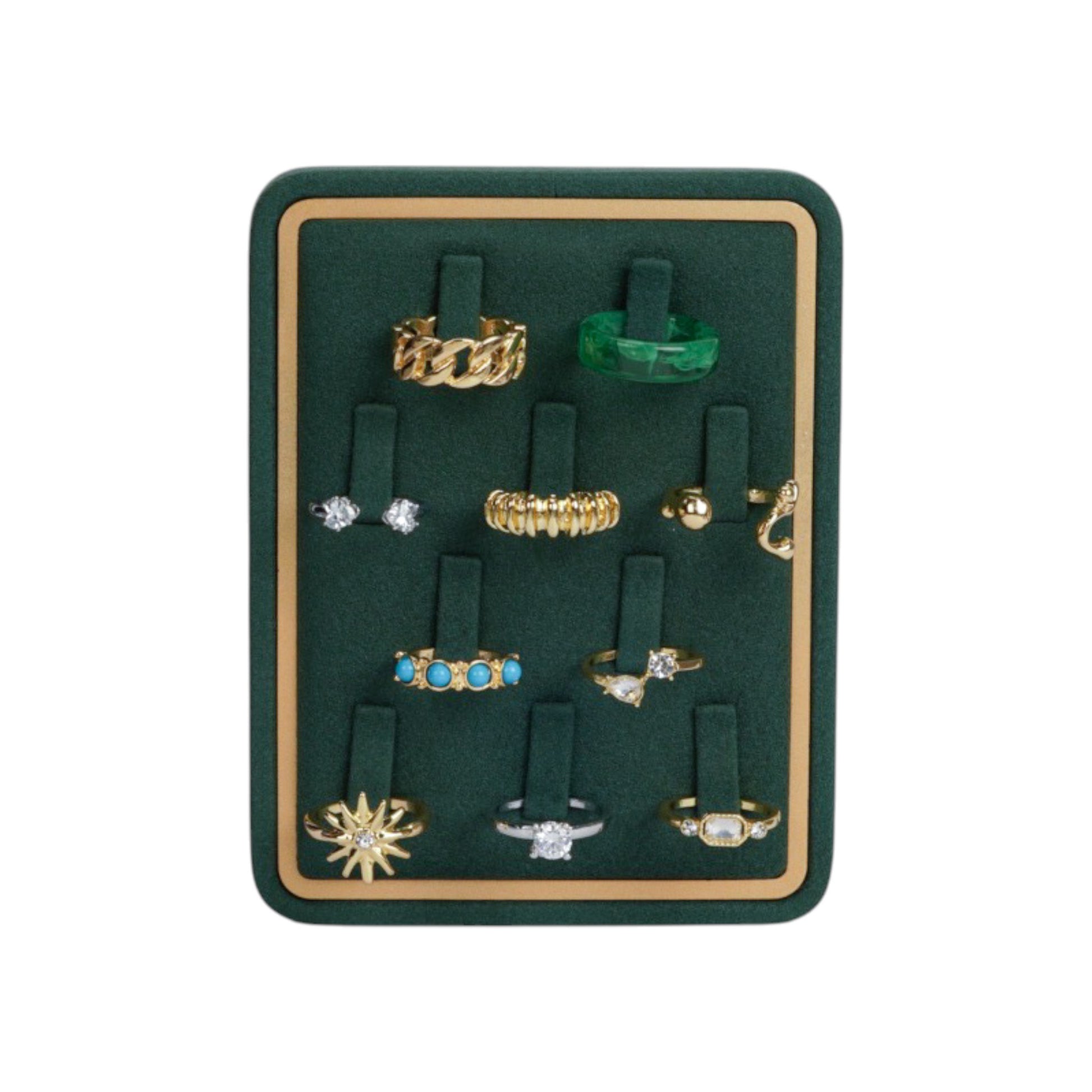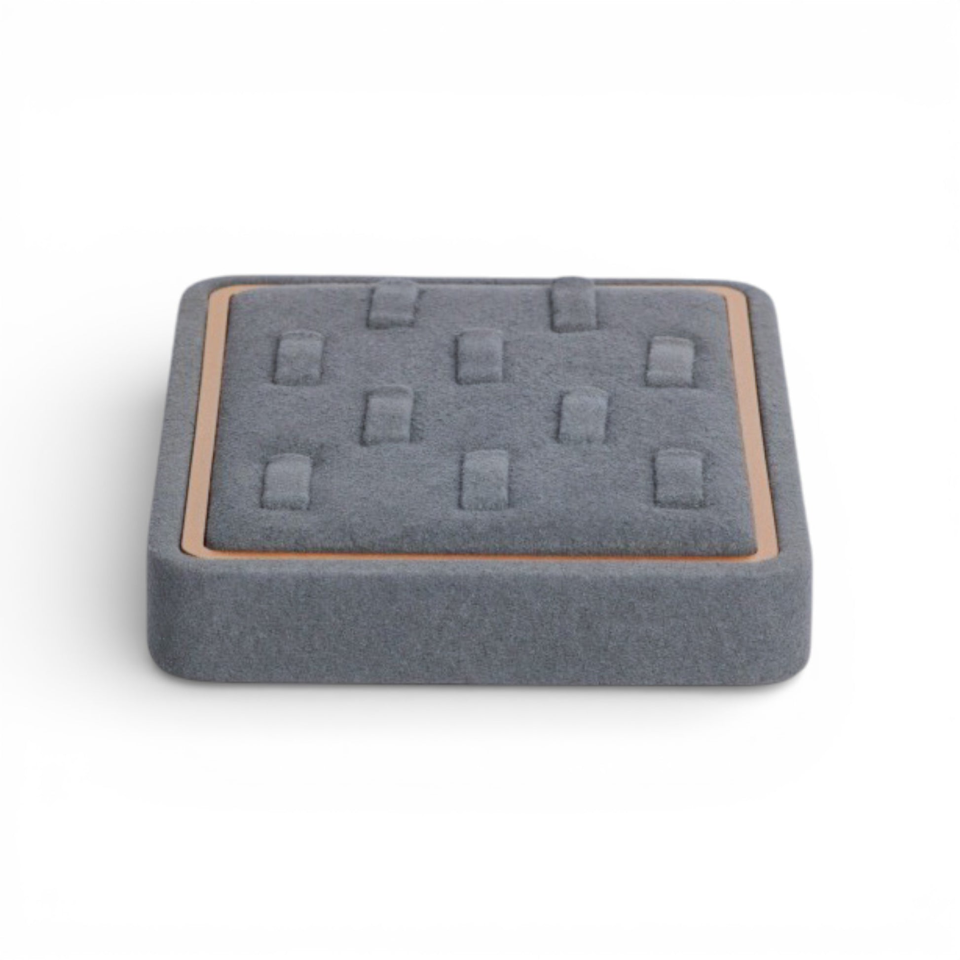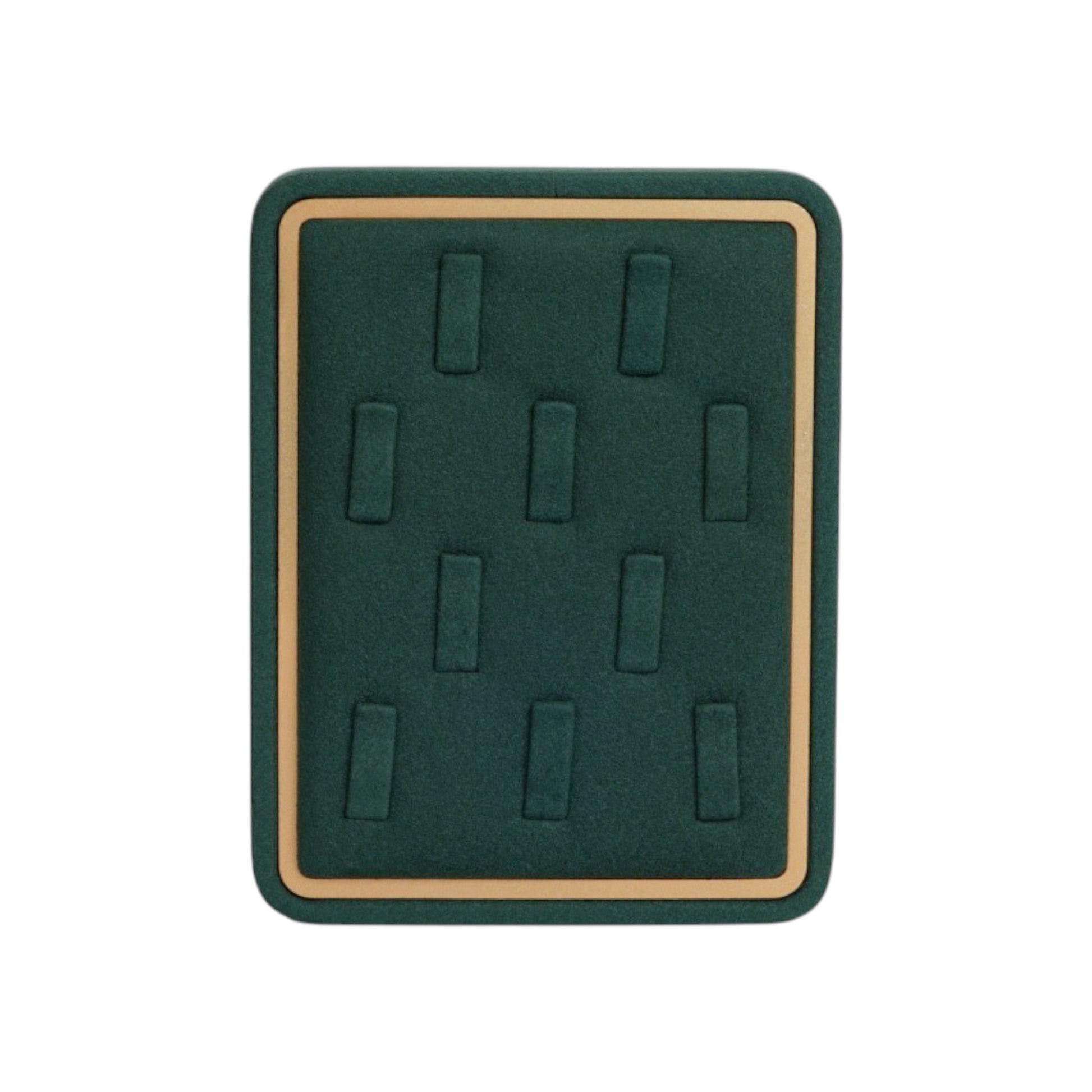 Designed for refined jewelry presentation, this ring display tray combines a soft fabric surface with a clean gold-accented frame. Its structured layout allows multiple rings to be displayed securely while maintaining a balanced and elegant visual rhythm.