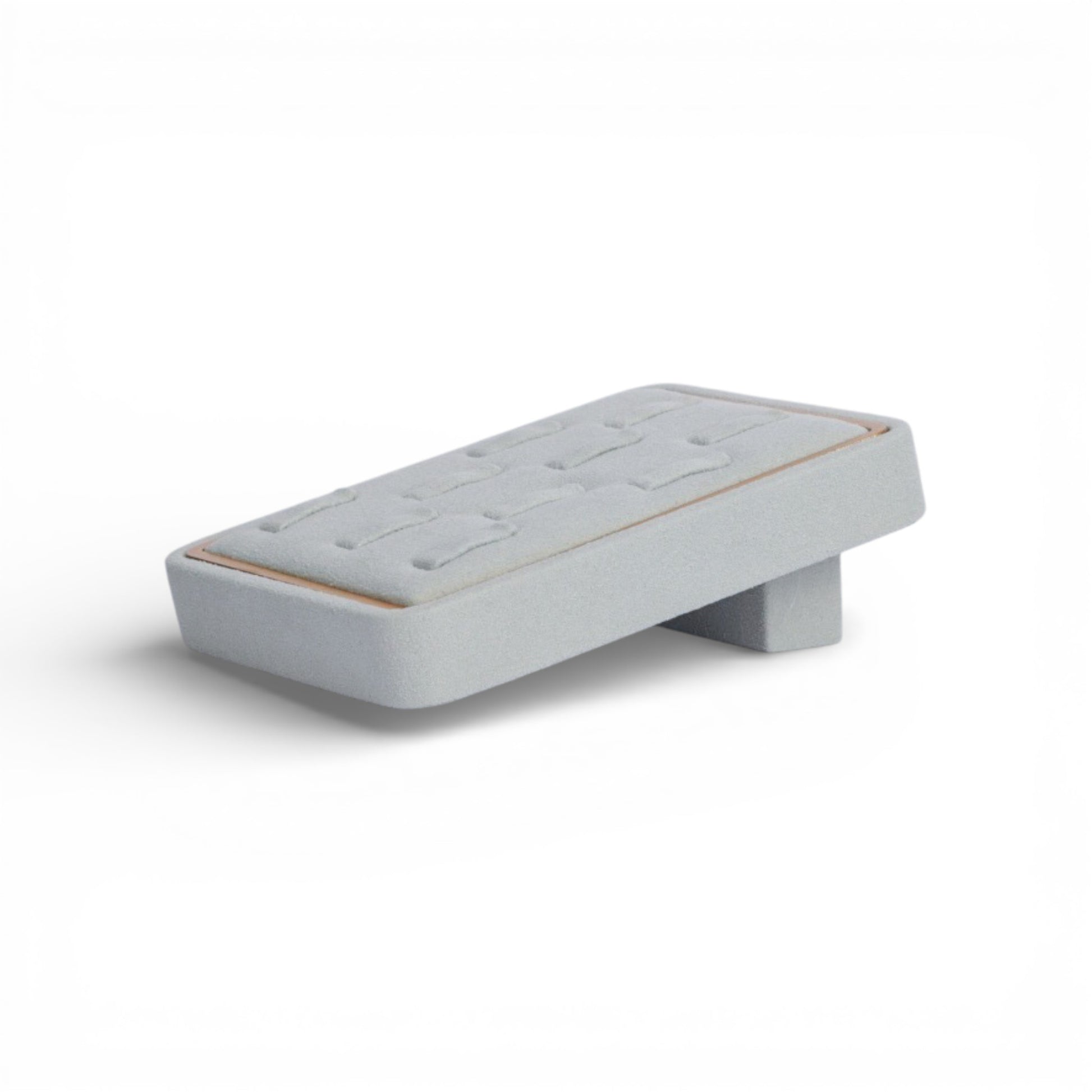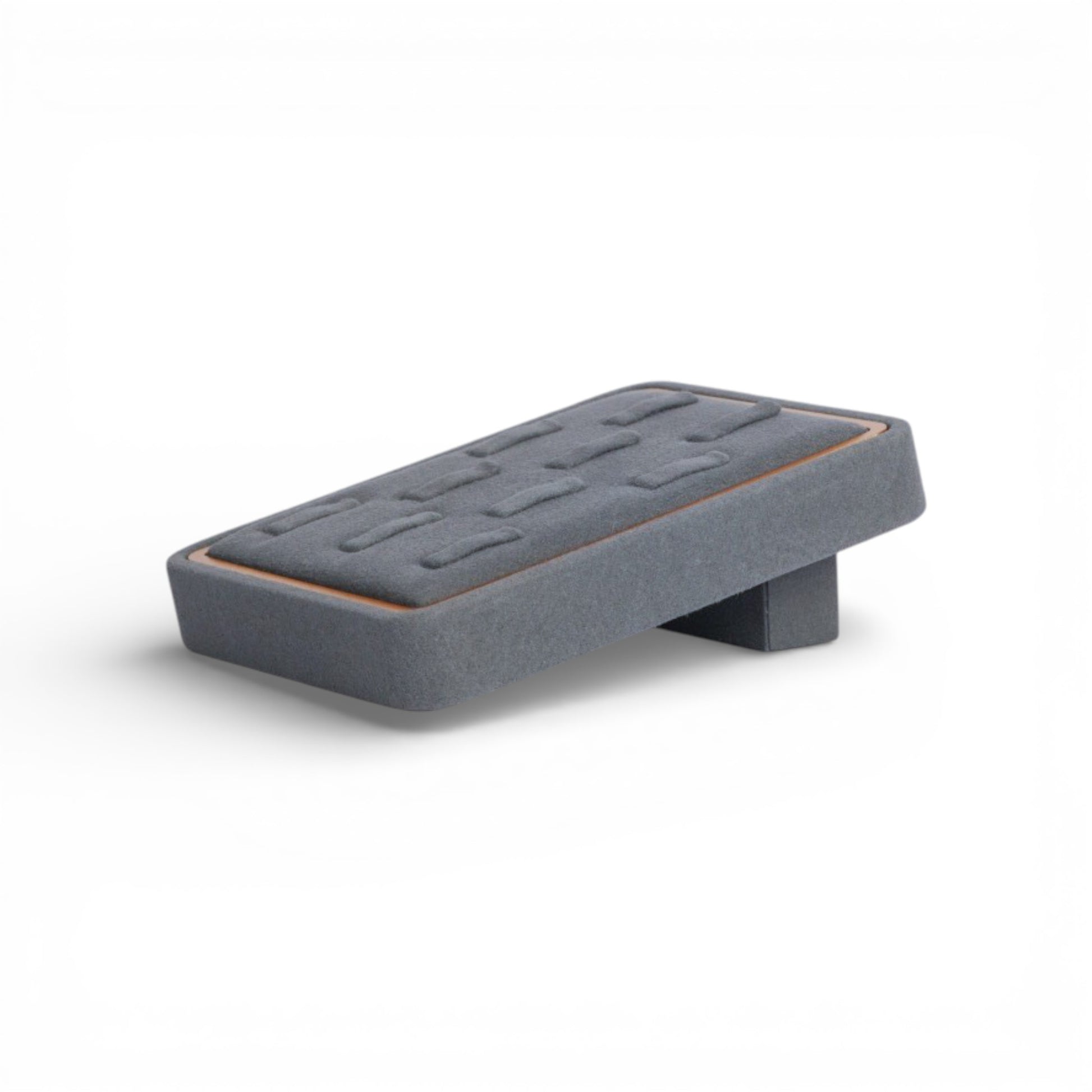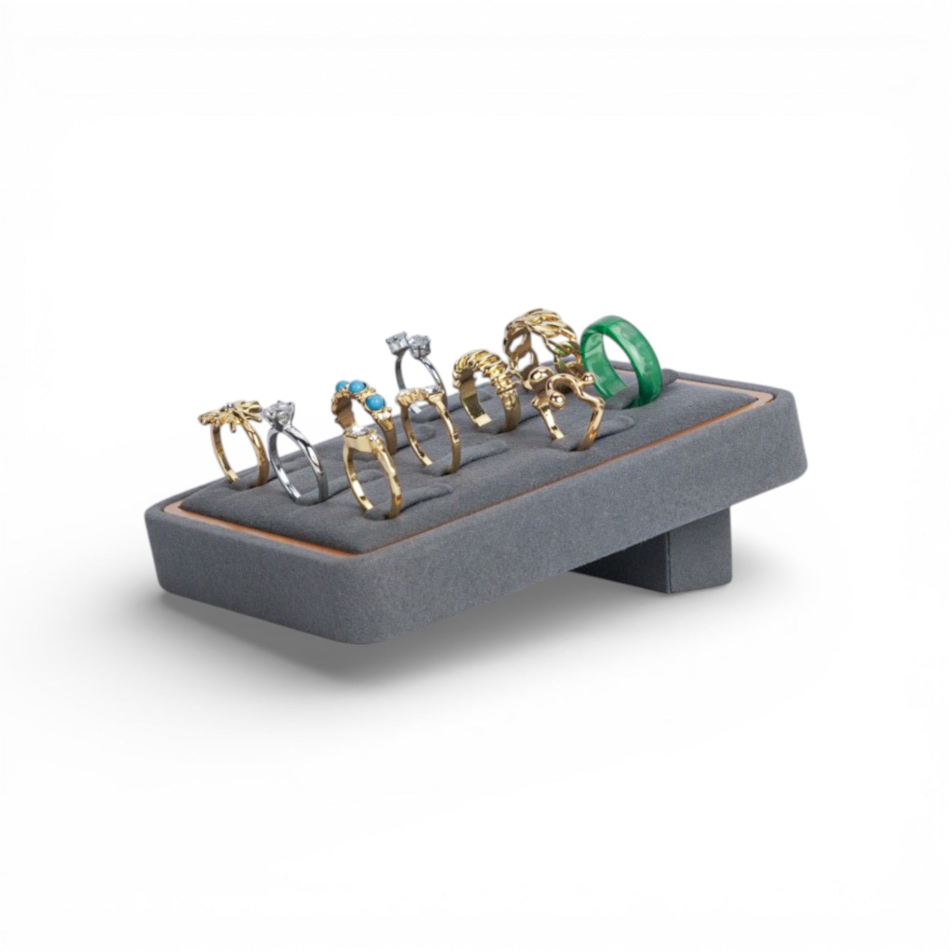 The fixed, non-magnetic construction ensures stability and durability, making it ideal for boutique counters, showroom displays, and professional jewelry photography. The neutral fabric tone enhances the brilliance of gold, silver, and gemstone rings without distraction.